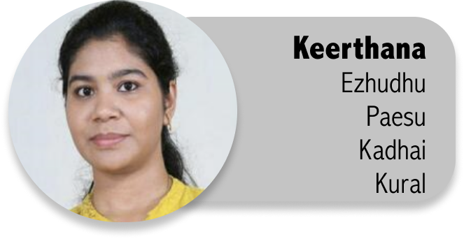 Now, its almost the end of the sessions. I can pronounce the Tamizh words correctly and clearly. I can write the words if someone dictated too. In the Ezhudhu sessions, we learnt the tips and tricks of word formation in the most entertaining way. Every session had a fun home assignment and a bonus weekend game too. I am happy that I learnt the Tamizh letters and words in the easiest way. I have started to read Tamizh write ups. It has been my all time dream to read Ponniyin Selvan. Thanks to Ezhudhu course and Suriyah madam that I have started to read it. It means a lot me.